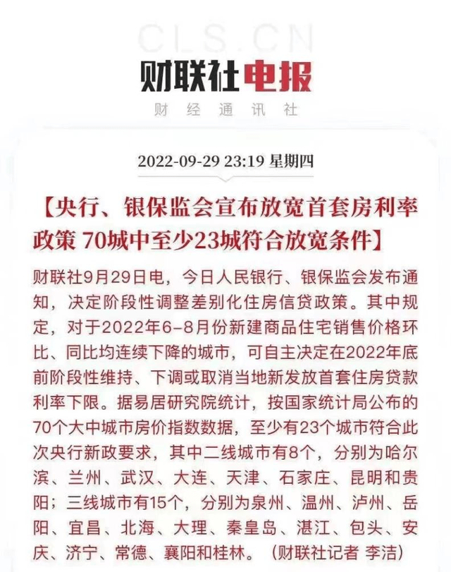 结合9月29日晚间,央行和银保监会宣布降低首套房贷利率下限,有机构预测将会跌破4.1%,至少23城符合新政门槛。