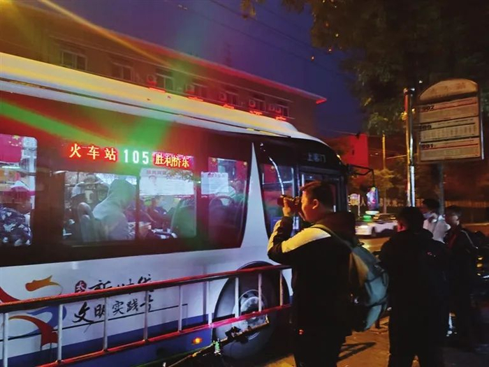 6时05分,车辆缓缓地经过五一广场走上了五一路,看着沿途景色,刚上车的一名年轻人不停地摁下了手中的相机快门。