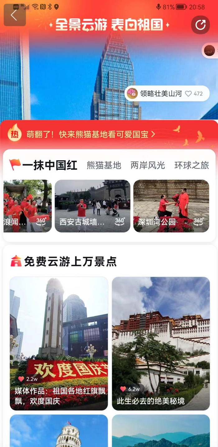 记者点开百度地图看到,不仅整个地图变成了“红色的海洋”,其还通过独有的360°全景模式上线了各个城市的“红色景点”。用户在百度地图搜索“全景采集中国红”即可进入活动页面,用户可以在活动页面中,足不出户地免费全景云游上万个景点。