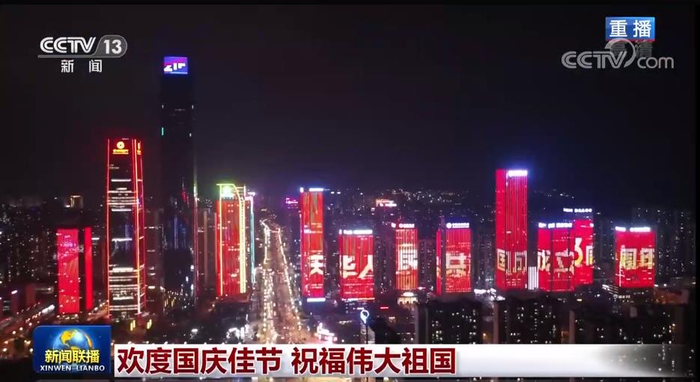 国庆之夜,华灯璀璨。在贵州贵阳,以“欢度国庆”“喜迎二十大”为主题的灯光秀扮靓都市夜空,表达对祖国的祝福;在江苏盐城,由500架无人机组成的“迎国庆”天幕秀,吸引了众多市民;在吉林敦化,流光溢彩的光影秀把城市装点得绚烂多姿,充满了节日喜庆。