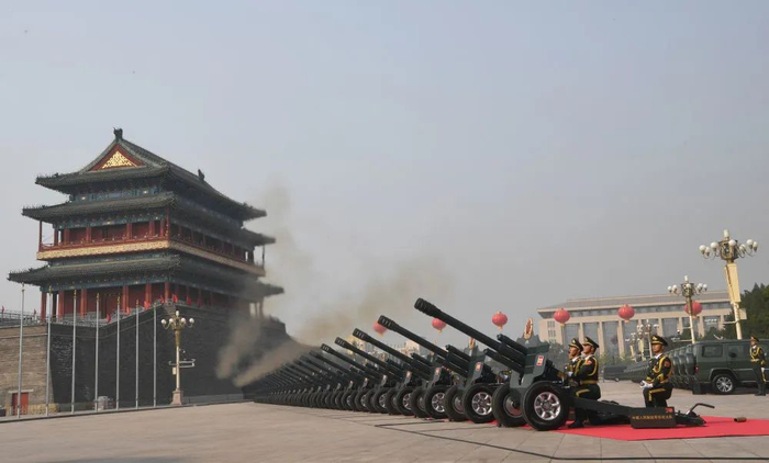 2019年10月1日,庆祝中华人民共和国成立70周年大会在北京天安门广场隆重举行。这是礼炮鸣响。新华社记者万象摄