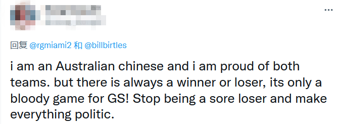 “我是一名澳大利亚华人,我同时为两支球队感到骄傲,但比赛总有胜负之分。别再做输不起的人了,一天天地啥事都往政治化走。”