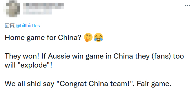 “中国主场比赛?笑哭了,人家赢了好吧!如果澳大利亚队在中国赢得比赛,那里的澳大利亚球迷也会嗨翻天的!我们应该说‘恭喜中国队!’,比赛是公平的。”
