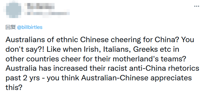 有细心的网民发现,发布上述这条酸不溜丢推文的同时,比尔还点赞了其他网民一条质问“在澳华人为何不为澳大利亚队加油”的推文,由此指出比尔是带着根深蒂固的种族主义和白人至上思想发布的推文。