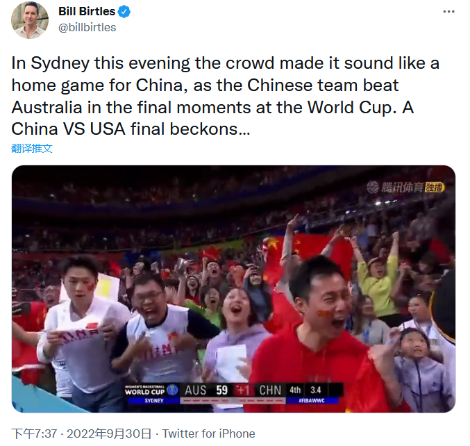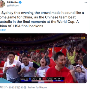 但这些在澳华人为中国队加油的阵阵叫好声,似乎让某些人觉得“刺耳”了。昨晚中国女篮战胜澳大利亚队后,澳大利亚广播公司(ABC)记者比尔·伯特尔斯(Bill Birtles)在个人推特上称“现场观众的反应听起来像是中国队的主场比赛”。同时他还点赞了一条质问“在澳华人为何为中国队加油,却不为澳大利亚队加油”的推文。