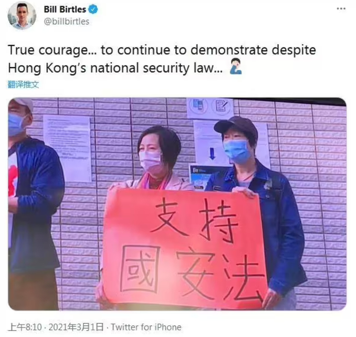 后来,比尔又用一张图试图抹黑中国香港国安法,结果自己反倒出尽洋相。他本想称赞那些反对国安法的示威者,但配图却是香港民众举牌支持香港国安法,一时之间让网民尴尬到恨不能用脚趾抠出一座悉尼歌剧院。