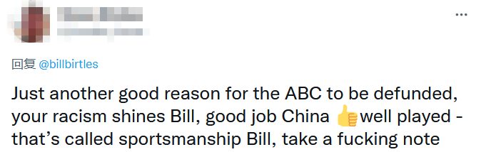 “中国队打得很好,这才是体育精神。而你,比尔,你的种族主义亮瞎我了。”
