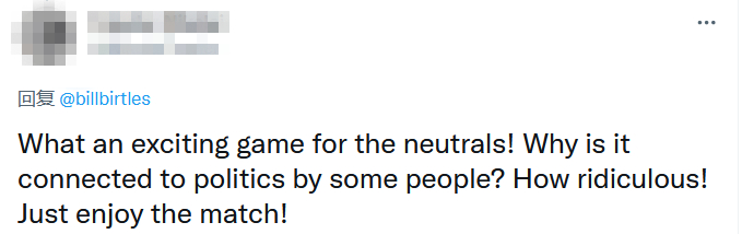 一些外国网民也看不下去,吐槽比尔坏人心情:本来看了一场这么精彩的比赛还怪兴奋的,偏偏来个不识趣的又双叒叕地在这儿操弄政治议题。