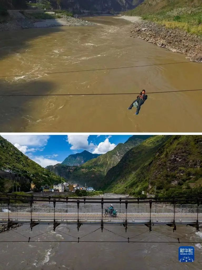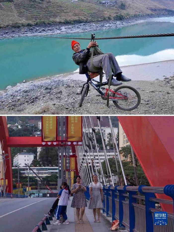 这是一张拼版照片:上图为一名男子带着自行车在怒江州泸水市六库街道双米地村辣子咪村民小组溜索过怒江。下图为2022年9月14日,居民在六库街道桥上散步休闲。新华社记者 蔺以光 岑云鹏 摄