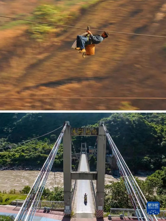 这是一张拼版照片:上图为2013年2月2日,在怒江州泸水市六库街道,一名居民背着背篓溜索过江。下图为2022年9月13日,泸水市居民骑摩托车通过大兴地桥。新华社记者 王长山 江文耀 摄