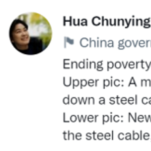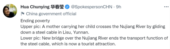 其中,在第十组对比照片中,华春莹的关键词是“消除贫困”。她写道:“2018年,云南怒江傈僳族自治州,一位母亲抱着孩子通过溜索横渡怒江;2020年,怒江上架起大桥,昔日的溜索已成为游客体验景点。”