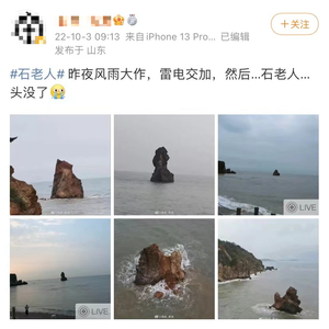 10月3日,有网友称,一夜雷电之后,青岛著名旅游地标“石老人礁石”的“头”没了。