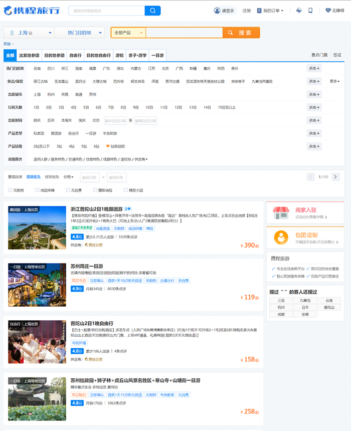 记者在携程上搜索从上海出发的旅游产品,结果显示,销量排名前三的旅游产品分别是浙江普陀山2日1晚跟团游、苏州周庄一日游与普陀山2日1晚自由行。从目的地距离来看,销量排名前十的旅游产品的目的地均位于江浙沪地区,其中四个旅游产品甚至是“足不出沪”的上海本地短途旅行。