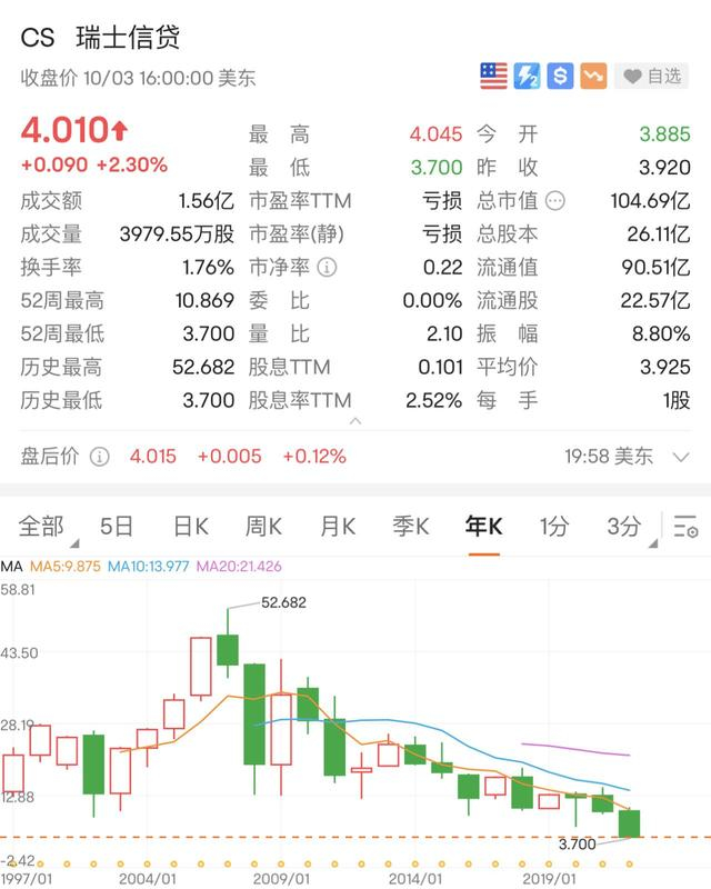 10月3日瑞信美股盘前跌7%,开盘后一度跌5.6%,股价创历史新低3.7美元,午盘转涨并收涨2.3%,报收4.01美元,今年以来瑞信的股价累计重挫57.75%。