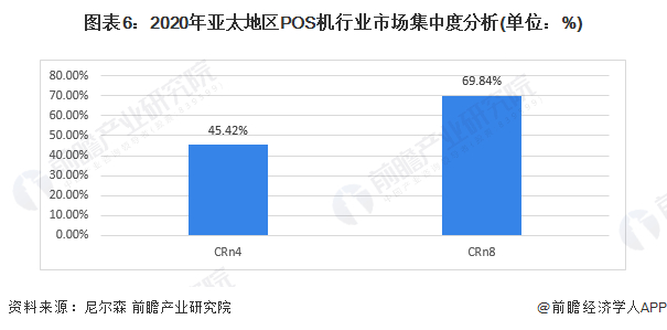 根据亚太地区POS终端出货量数据,可得2020年行业CR4为45.42%,大于30%,行业CRn8为69.84%,接近70%,行业集中度较高。根据美国经济学家贝恩和日本通产省对产业集中度的划分标准,亚太地区POS机产业属于寡占型市场。