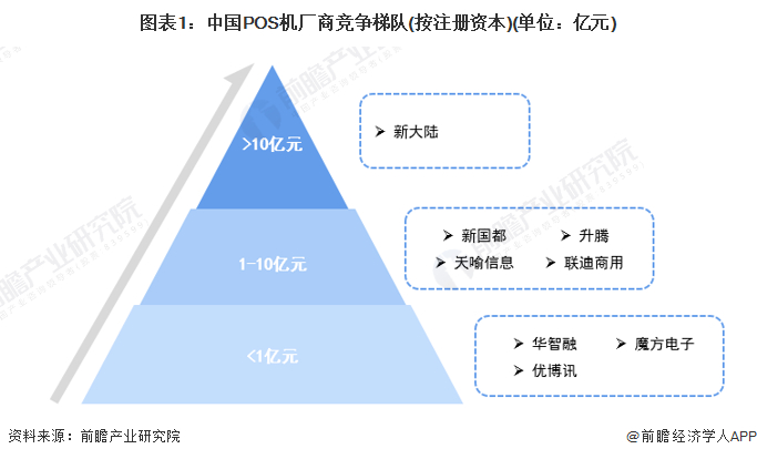 POS机厂商依据企业的注册资本划分,可分为3个竞争梯队。其中,注册资本大于10亿元的企业有新大陆;注册资本在1-10亿元之间的企业有:新国都、天喻信息、联迪商用、升腾资讯等;注册资本在1亿元以下的企业有华智融、魔方电子、优博讯等。