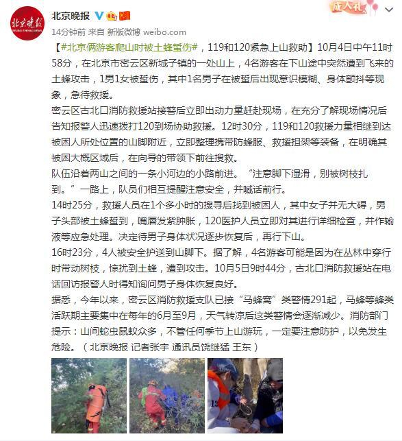 10月4日中午11时58分,在北京市密云区新城子镇的一处山上,4名游客在下山途中突然遭到飞来的土蜂攻击,1男1女被蜇伤,其中1名男子在被蜇后出现意识模糊、身体颤抖等现象,急待救援。
