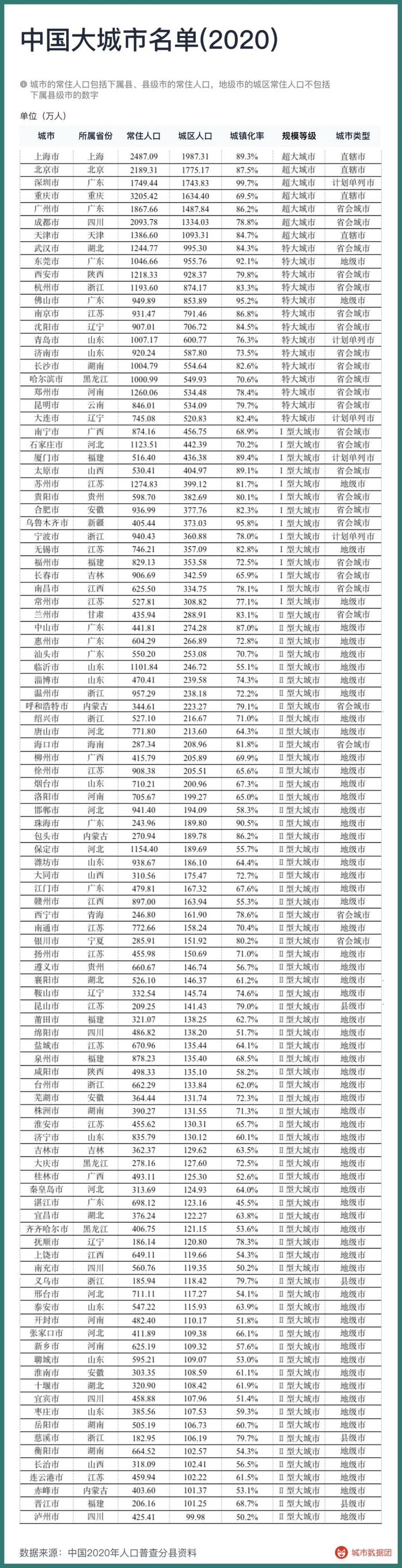 下面的表格列出了中国全部大城市(共计105个)的名单,包括21个超特大城市和84个大城市,分别给出了该城市的常住人口、城镇化率、城区常住人口、城市规模等级和城市类型。(我们在附表中,还给出了全部的中等城市和小城市的名单。)