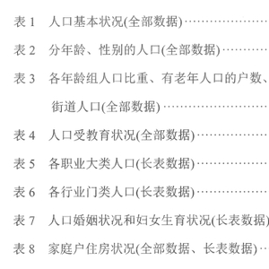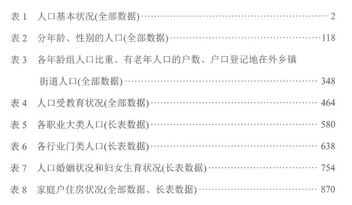 本次人口普查分县资料和2000、2010年两次资料类似,均包括八份表格,其中表1至表4来自调查到所有人口的人口普查短表,而与就业、婚育、住房相关的表5至表8汇总来自十分之一抽样的人口普查长表。