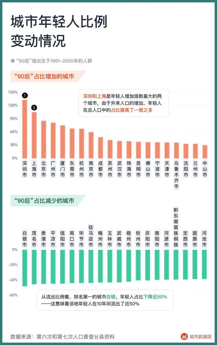 有的城市年轻人在增加,自然就有城市的年轻人在减少。从流出比例看,排名第一的城市白银,年轻人占比下降近50%——这意味着该地年轻人在10年间流出了近50%。第二名茂名市,虽然也处于广东,但依然流出了45%的年轻人。