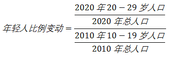 为了解决这个问题,我们使用下式,计算两个年龄段在两个普查年度的人口比例,再计算该比例的变化,定义为“年轻人比例变动”,来代表每个城市的年轻人增长情况,该方法可以避免人口总量变动带来的影响: