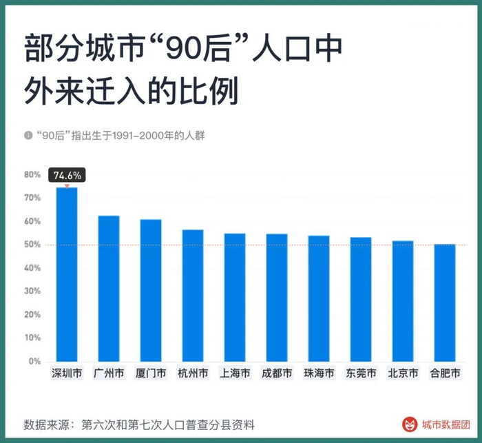 如果把20-29岁人口定义为年轻人,那么从上图可以看到,深圳的年轻人口有74.6%是在2010-2020年间从外地迁入的。外来人口也贡献了广州、厦门超过60%的年轻人,上海、成都、珠海、东莞、北京、合肥超过50%的年轻人。