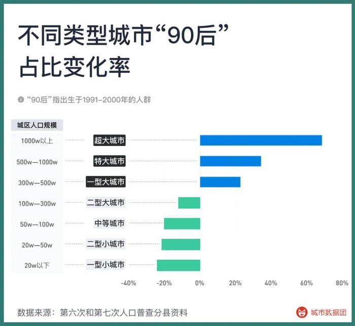 越是大城市,在过去的十年中越是会成为年轻人的磁石。随着城市规模的降低,年轻人增加数量逐渐下降。在人口300万人以下的城市中,年轻人的占比则在减少。