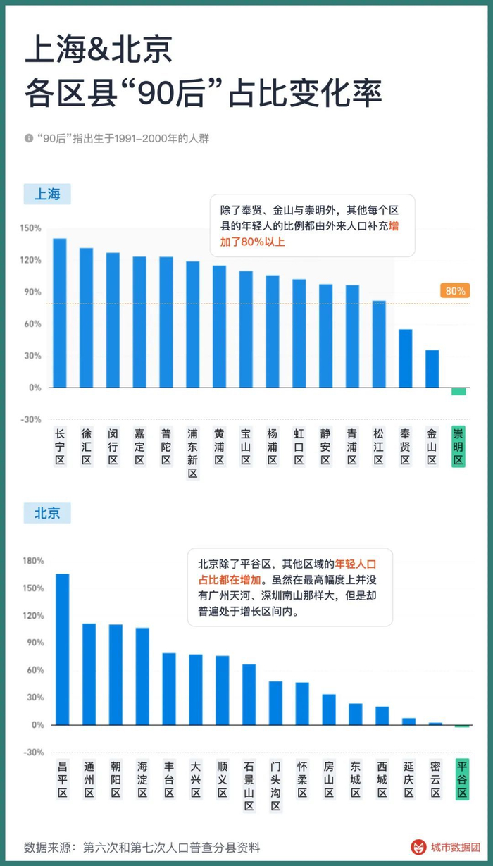 从以上两张图可以看到,上海除了崇明区,北京除了平谷区,其他区域的年轻人口占比都在增加。虽然在最高幅度上并没有广州天河、深圳南山那样大,但是却普遍处于增长区间内。尤其是上海,除了奉贤、金山与崇明外,其他每个区县的年轻人的比例都由外来人口补充增加了80%以上。