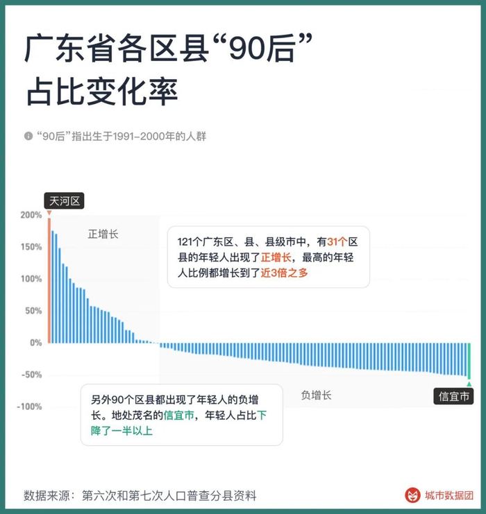 下图可以看到,121个广东区、县、县级市中,有31个区县的年轻人出现了正增长,最高的年轻人比例都增长到了近3倍之多。但与此同时,另外90个区县都出现了年轻人的负增长。地处茂名的信宜市,年轻人占比下降了一半以上。