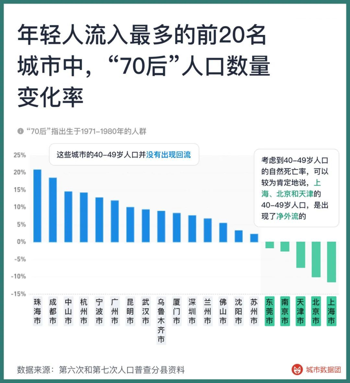 20-29岁人口的变化,代表了年轻人的迁徙方向。但来到深圳、上海的年轻人,20年后,会做出怎样的选择?是在城市站稳脚跟,还是回到家乡?这个问题只有未来能告诉我们答案,但我们可以从“90后”的前辈“70后”们的身上看到一些端倪。