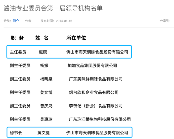 该协会专家工作委员会领导机构名单显示,海天味业的黄文彪是副主任委员,他的另一个身份是海天味业副总裁。