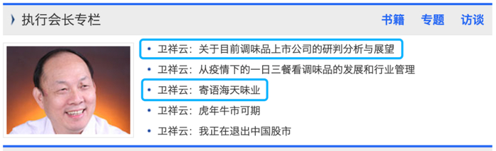 在该协会官网“执行会长专栏”中,最近一共发表了5篇文章,其中两篇都和海天味业有关。