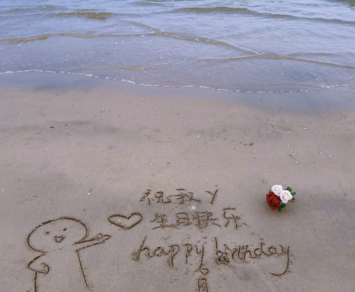 “客户越来越多,需求也越来越多,有的想要道具增加氛围感,有的要求画风和字体,现在已经有美院的学生、书法爱好者、业余摄影师在沙滩上作画写字,很多客户会要求拍照时帮忙摆放鲜花或者点燃仙女棒。”