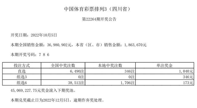 中国体育彩票排列3第22264期全国销售36980902元。开奖号码:7 8 6。