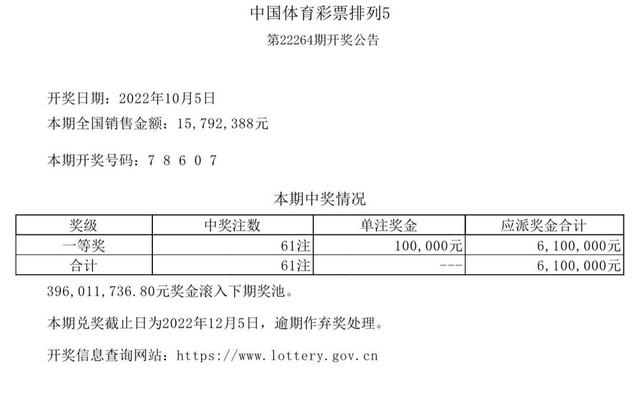 中国体育彩票排列5第22264期全国销售15792388元。开奖号码:7 8 6 0 7。