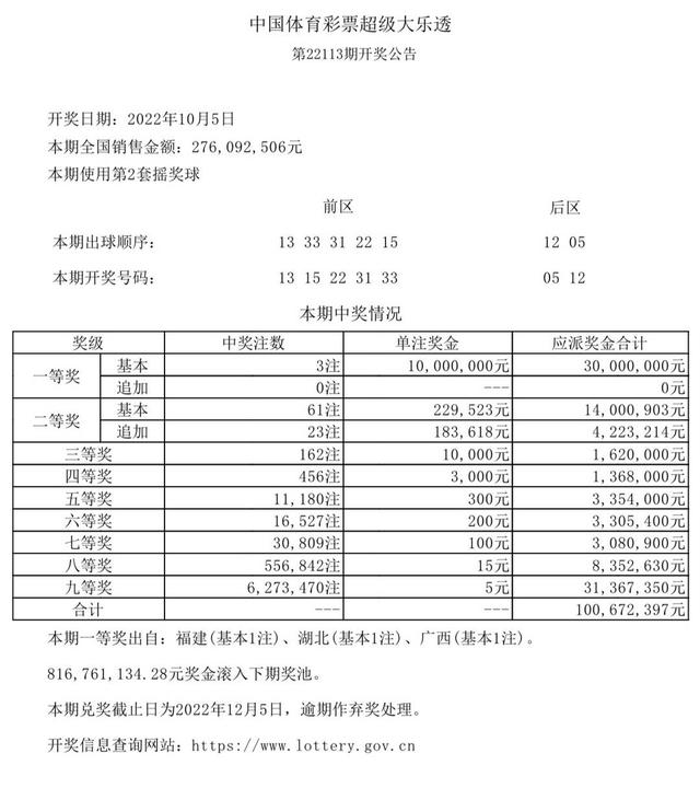 中国体育彩票超级大乐透第22113期全国销售276092506元。开奖号码:13 15 22 31 33 05 12。