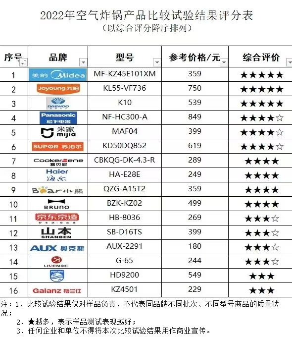 据披露,本次比较试验通过各类电商平台,共计购买20款空气炸锅,涉及美的、松下、飞利浦、海尔、九阳等品牌,容量为2.8升到5.5升不等,价格在179.9元至749.9元之间。