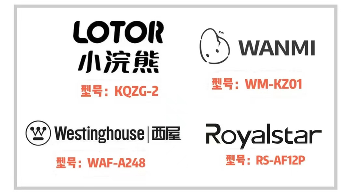 测评指出,有4款样品不符合国家相关标准要求,存在一定的电气安全隐患。标称品牌分别为:WANMI(型号WM-KZ01)、西屋(型号WAF-A248)、小浣熊(型号KQZG-2)、Royalstar(型号RS-AF12P)。