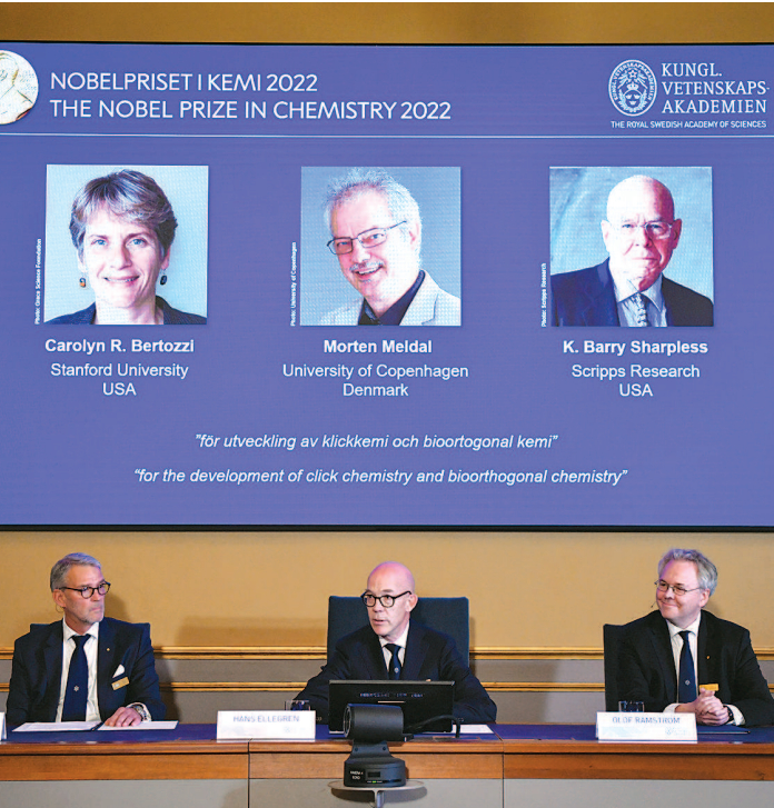 昨天,瑞典皇家科学院宣布,将2022年诺贝尔化学奖授予美国科学家卡罗琳·贝尔托齐、卡尔·巴里·夏普利斯和丹麦科学家莫滕·梅尔达尔,以表彰他们在发展点击化学和生物正交化学方面的贡献。