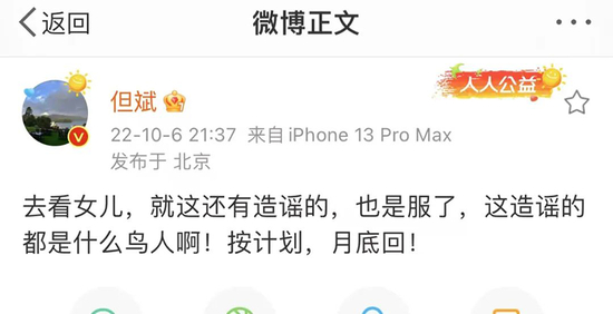 6日晚间,但斌发微博辟谣称:”去看女儿,就这还有造谣的,也是服了……按计划,月底回!”