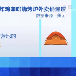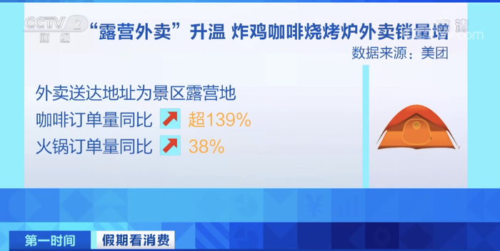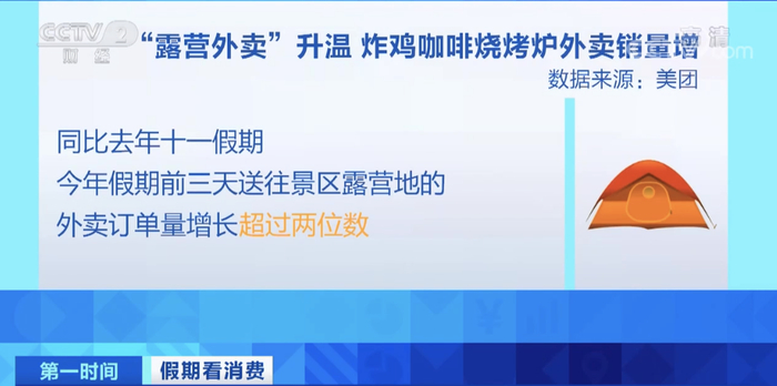 相关数据显示,同比去年十一假期,今年假期前三天送往景区露营地的外卖订单量增长超过两位数,销量前三的品类为炸鸡、咖啡和烧烤炉。