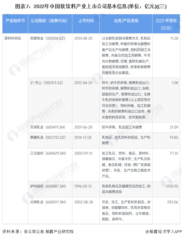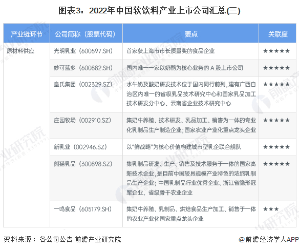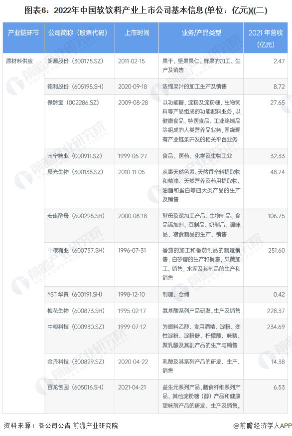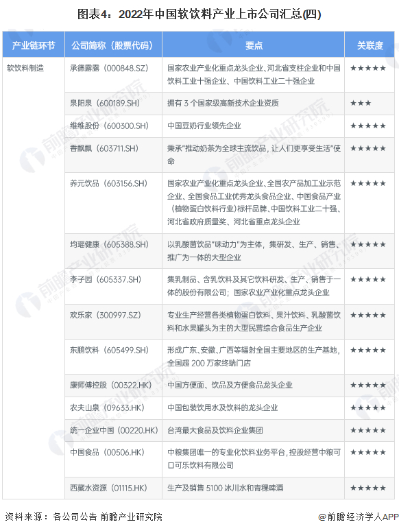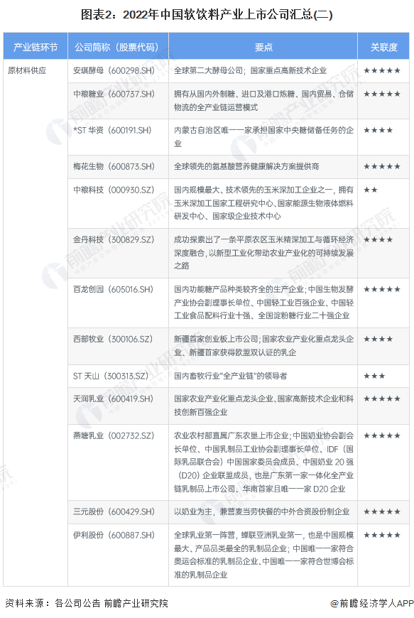 目前,我国软饮料产业的上市公司数量较多,主要分布在产业链上游的原材料供应企业和产业链中游的软饮料制造企业。