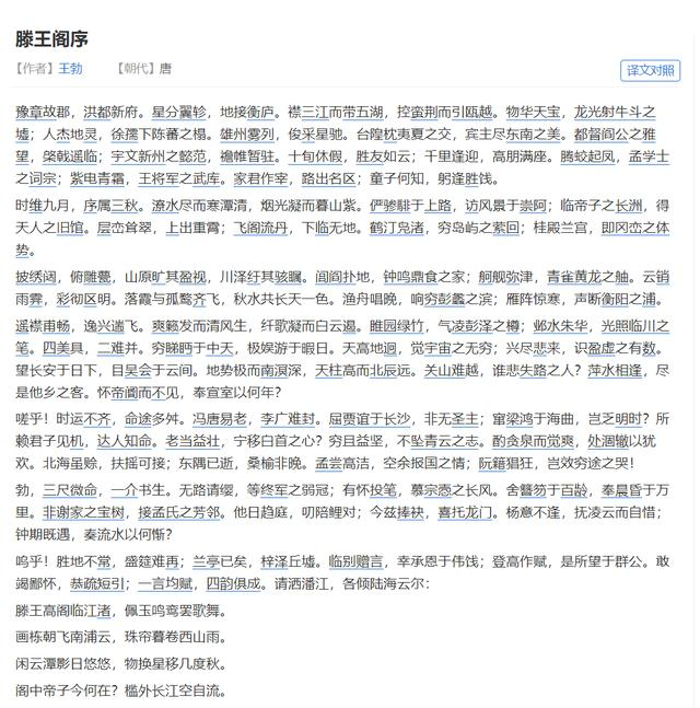 据悉,《滕王阁序》是唐代文学家王勃创作的一篇骈文,句法以四字句、六字句为多,全文共773个字,包含了40个成语。
