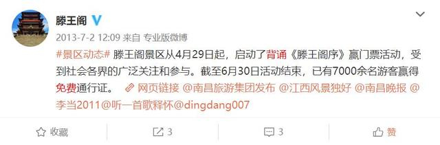 九派新闻注意到,早在2013年,滕王阁官方平台就推出完整背诵出《滕王阁序》,就可免费参观滕王阁的活动。