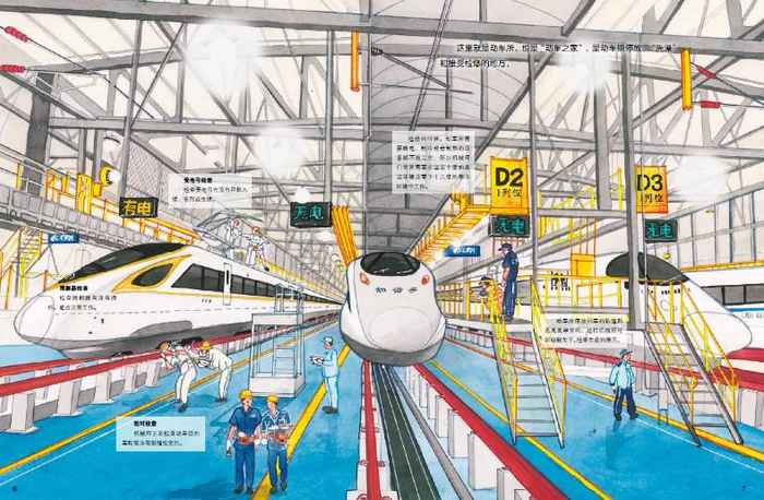 在《高铁出发了》中,以“北京西-广州南”的一趟高铁旅程为线索,通过讲述列车一路的“经历”,将中国高铁的车体设计、站台设计、供电系统、隧道设计等知识融入其中。在《高铁开工了》中,孩子可以跟随工程师的脚步,通过一条高速铁路的修建过程,了解高铁建设中的前沿工程知识,包括轨道结构、轨道板生产、架桥机和隧道修建等。在《一起坐高铁》中,则是讲了在“北京南-上海虹桥”的高铁之旅中,通过展示司机张叔叔的工作与小饭团一家乘坐高铁的过程,讲解了“复兴号”的运营、检修、驾驶操作和动车服务设施等。
