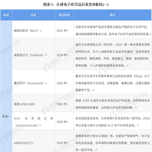 目前全球电子化学品行业公司主要集中在欧美、日本、韩国,总体形成垄断地位。其中,欧美代表性公司有德国巴斯夫(Basf)、陶氏化学化学(DOW)等;日本代表性公司有关东化学(Kanto)、住友化学(Sumitomo)等;韩国代表性公司有东进世美肯科技有限公司、ENF科技有限公司等。