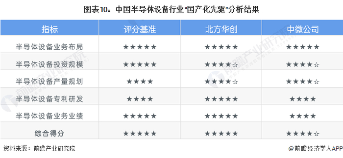 半导体设备行业属于技术、资金双密集产业,此外,半导体设备市场份额和业绩能反应公司产品的市场销售状况。基于前文分析结果,前瞻认为,北方华创因在产量规划、营业收入、毛利率、投资规模等方面占有优势,尽管中微公司在半导体设备专业化程度更高,但是从可持续发展的角度看,未来北方华创国产化进程及实现国产占有率第一的潜力更大。
