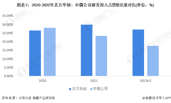 2020-2022年,北方华创研发投入占营业收入比重在25%以上,占比呈上升趋势,2022上半年占比有所下降至27.1%;中微公司研发投入占营业收入比重2021年被北方华创超越,2022上半年占比下降至17.56%。从均值来看,北方华创研发投入占比较中微公司高。