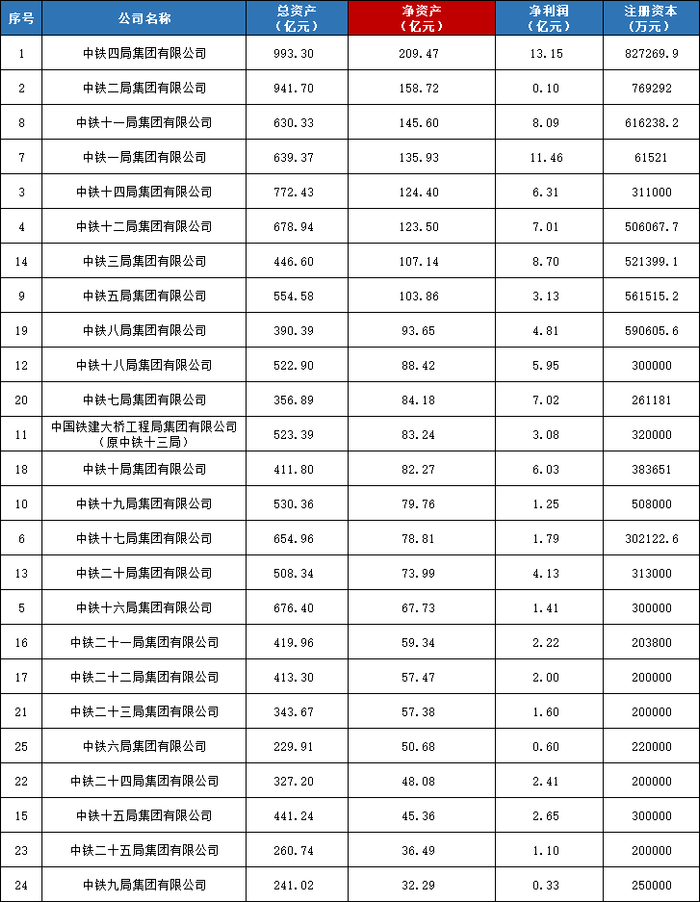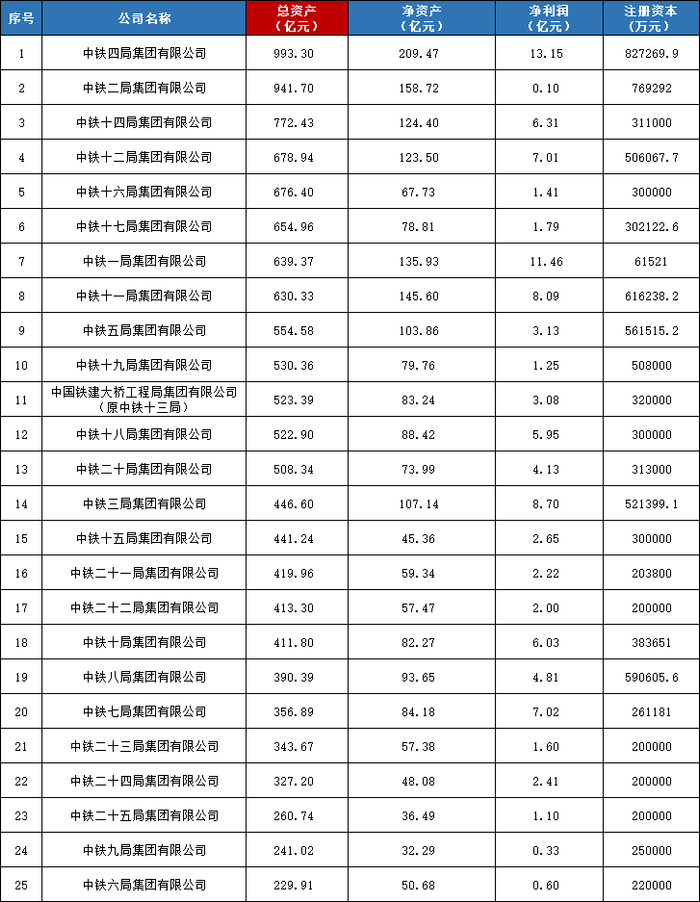 两大公司报告中相继公布了各子公司情况,作为两大建筑央企下面的25个二级号码子公司,中铁1到25局,也都实力非常强劲,RT轨道交通小编摘取2022上半年中铁1到25局数据,分别从总资产、净资产、净利润三个方面进行对比,到底哪个实力更胜一筹?