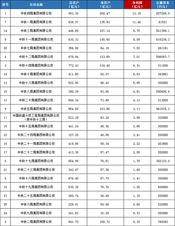中铁二局、中铁六局、中铁九局净利润未超过1亿元,排名比较靠后。